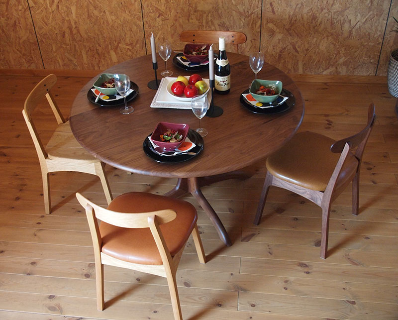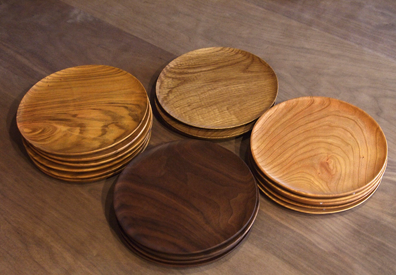 プレート類です。 まずは丸いお皿。 時計回りで上からナラ、チェリー、ウォールナット、サクラ。 そして削りだしプレート 右がクリで左2列がチェリー。 2015(春)家具・小物市のご案内