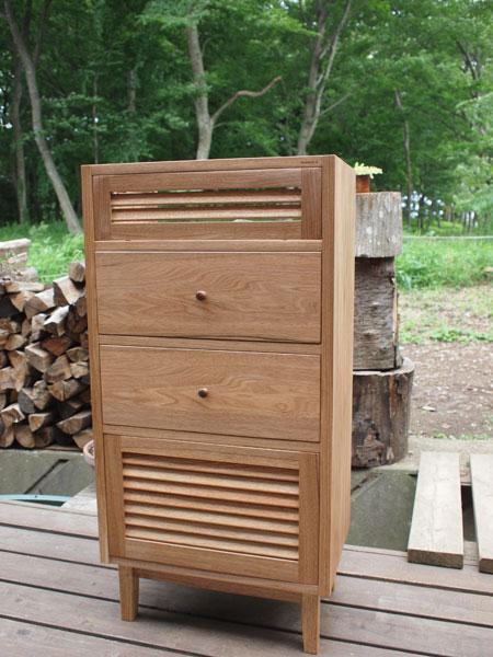 ずいぶんと時間を要しましたが、キッチンカウンターの下に入るAVラック部分が完成! 材はクルミ。 ルーバーが機器の熱を逃がすようになっています。 上部はDVDプレイヤー等を収納し、ルーバー部は手前に倒れるように開き、下部は …